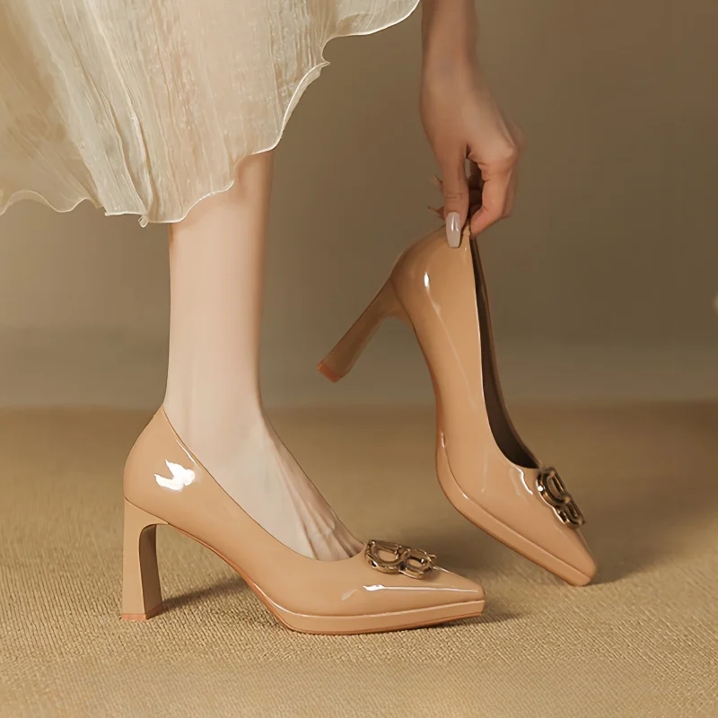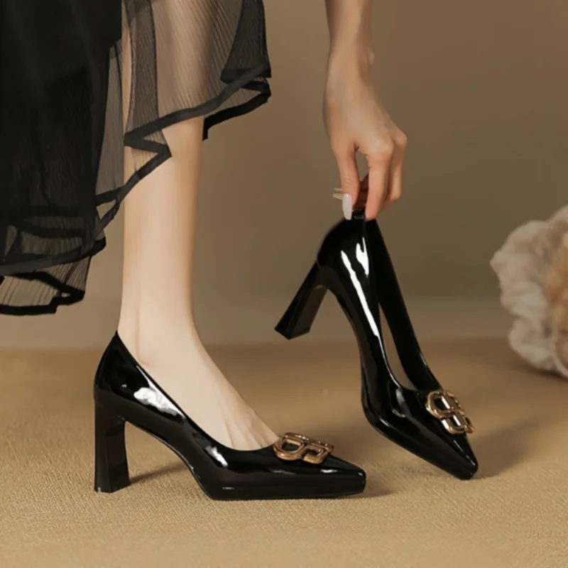 2026 New Premium Patent Leather Black 8cm square Wedding Women's Office Slip-On Closed Toe Height Increasing Sexy Elegant Heels